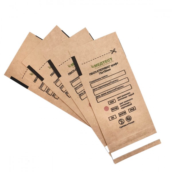 Крафт пакеты для инструментов сделаны из крафт бумаги, имеют клейкий край для заклеивания, а также индикатор — свидетель, для паровой и воздушной стерилизации. Крафт пакеты удобны при упаковке, так как не требуют специального оборудования. Легко сохраняют целостность после проведения стерилизации. Срок хранения изделий после стерилизации в крафт пакетах не более 60 суток.